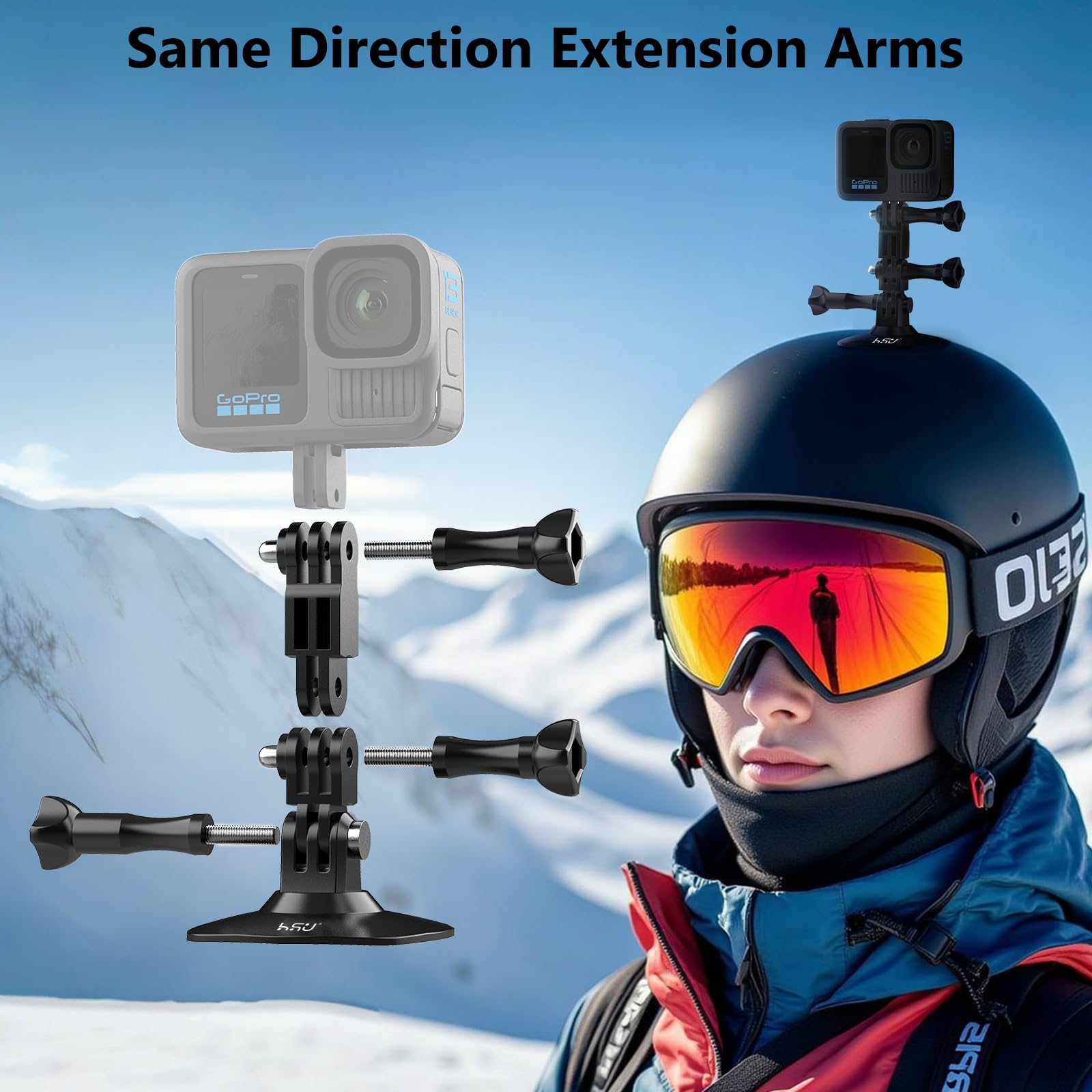 HSU Flexible Adhesive Mount with 3M Adhesive Sticky, Same & Vertical Direction Adjust Arm Compatible with Insta360 X4 X3 X2 X One RS, GoPro Hero 13/12/11/10/9/8/7, DJI Osmo Action Camera Accessories