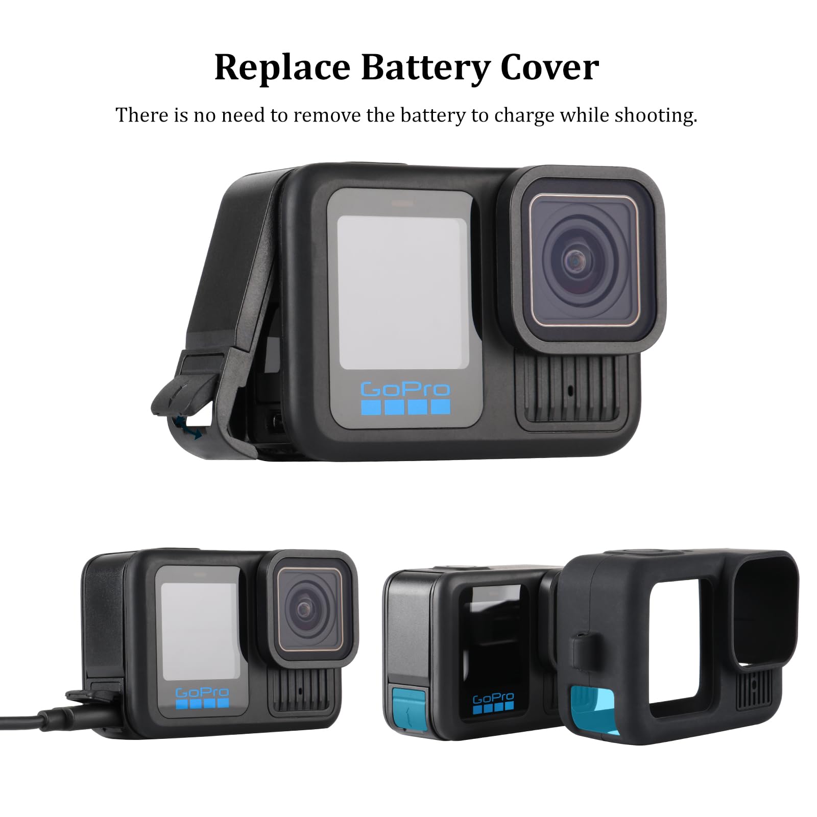 - Battery Cover: The replacement door has a safe external adapter, reserving the interface, allows your camera to be charged or connected to the microphone adapter directly without opening the side cover. Perfect for continuous shooting especially for recording time-lapse or video. The built-in sponge has good cushioning, shock resistance, provide full protection, extend the battery life. 【 NOTE】The replaced side door cannot be directly immersed in water for use!